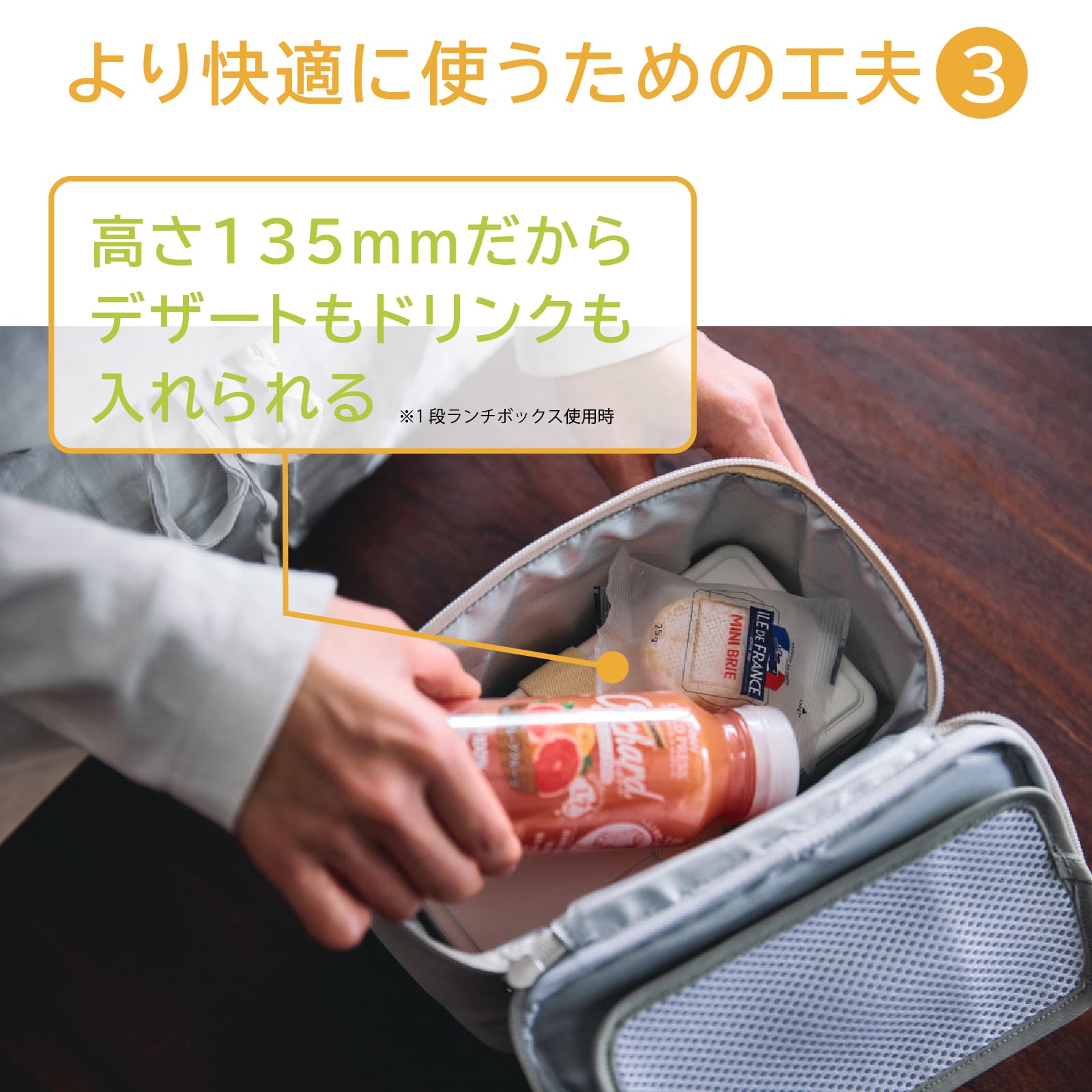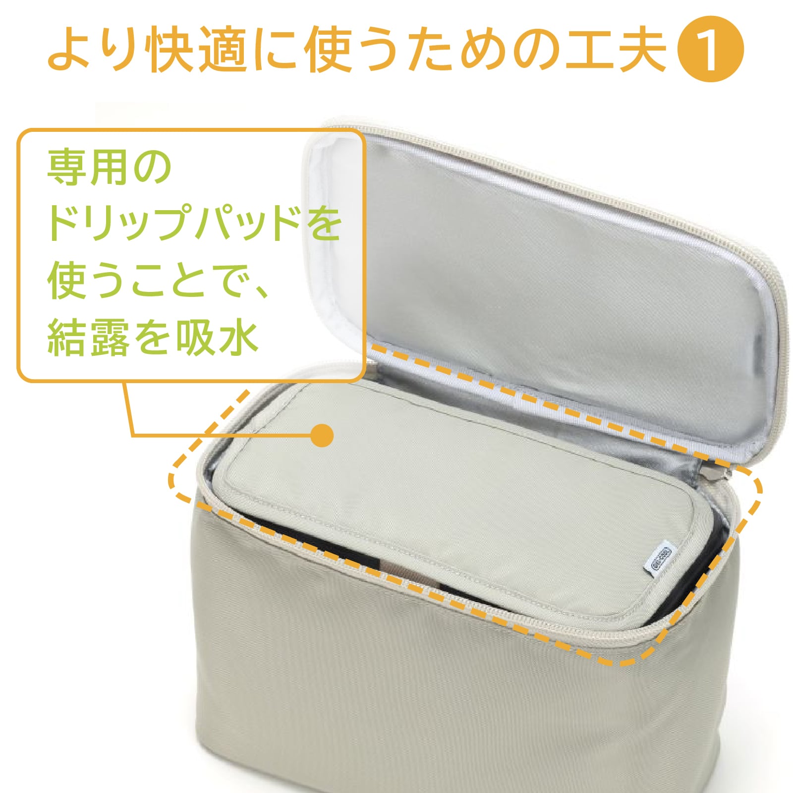 成長期のお子さんや運動部の中高生、体をつかったお仕事の方など、大容量のお弁当を安心して食べてもらうための保冷ポーチです。GEL-COOL W(2段の1000mlタイプ)にフィットするよう設計されていますが、他のお弁当箱にもサイズが合えば使用OK。付属の専用ドリップパッドは結露を吸収し、カトラリーレストにもなります。夏場でも安心の高い保冷効果を提供します。