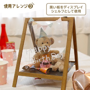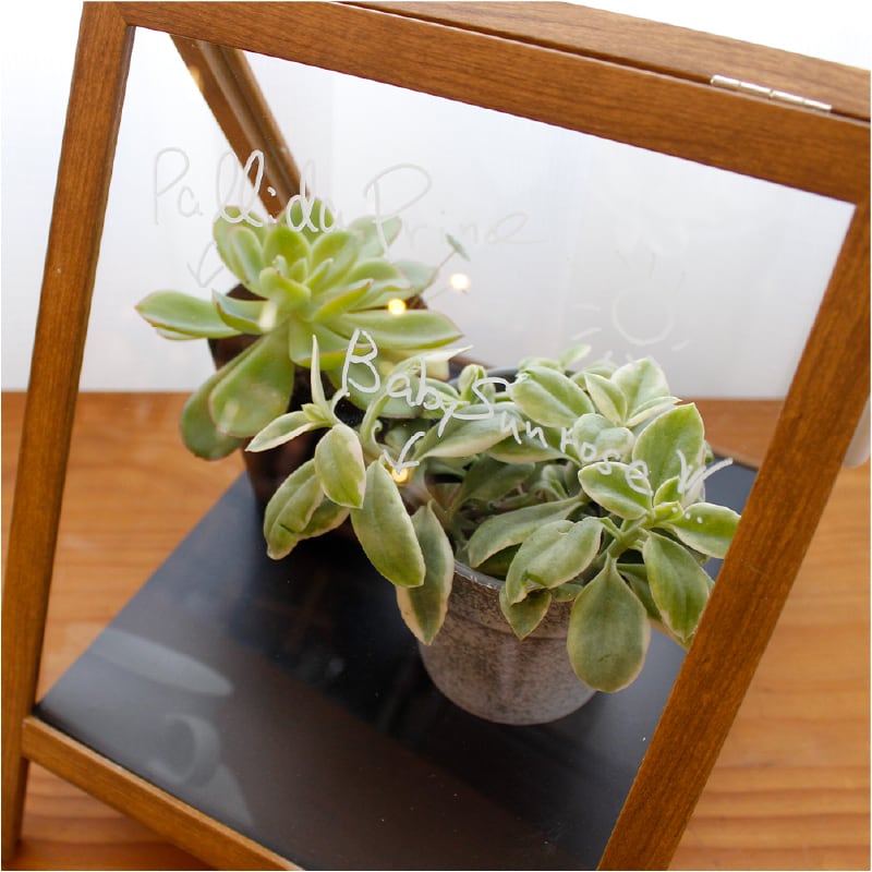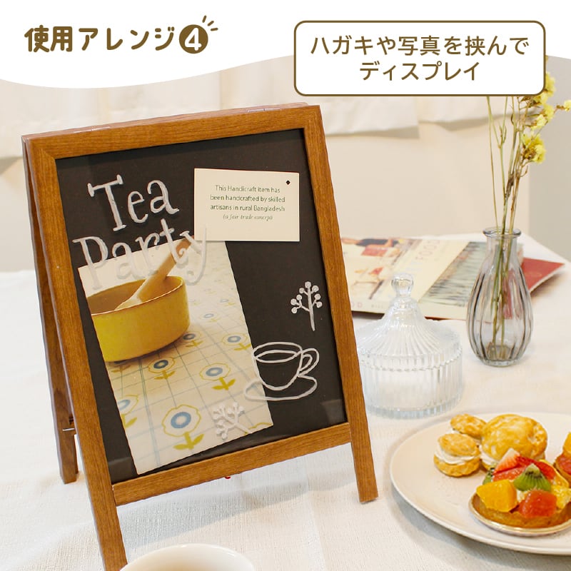 付属の黒い板を使用し、写真を挟んだり、黒板風に使ったり、フレームの内側に橋渡しをして植物やお菓子を飾るディスプレイシェルフにしたり、使用バリエーションが多彩。