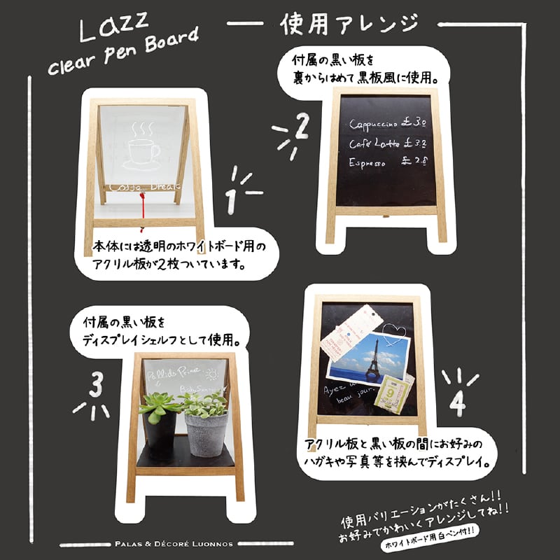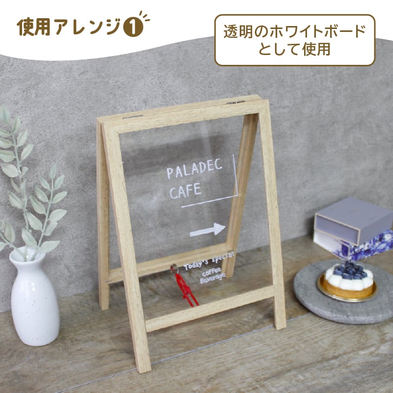 透明ホワイトボード・黒板・ディスプレイシェルフとして使るユーティリティーボードです。木目フレームとクリアなボードで、 お部屋のインテリア・オフィスのメッセージボード・お店のメニューにも使用できます。さらに、付属の黒い板を使用し、写真を挟んだり、黒板風に使ったり、フレームの内側に橋渡しをして植物やお菓子を飾るディスプレイシェルフにしたり、使用バリエーションがたくさん! お好みでかわいくアレンジしてみてください。