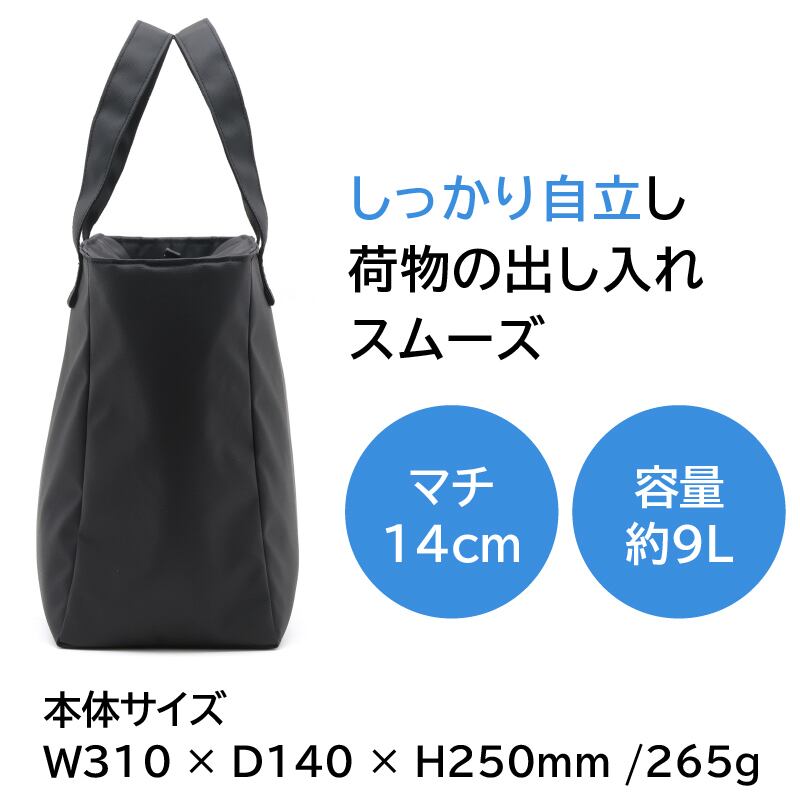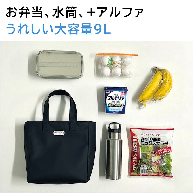 容量はなんと9L!お弁当箱やボトルはもちろん、デザートやスープジャーを入れても余裕のあるサイズ感が魅力です。仕事や学校から帰る途中での買い物にもぴったり。多様なシーンに対応できる大容量のバッグとなっています。