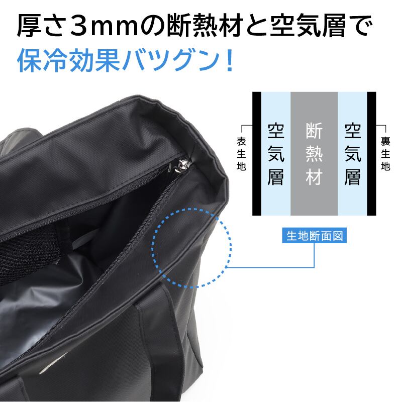 バッグ内側には3mmの断熱材がしっかり内蔵されており、開口部がフルジップ仕様になっているため、冷気を逃しにくいのが特長です。暑さの厳しい夏場でも安心してお弁当や飲み物を持ち運ぶことができます。お昼のランチタイムを快適に守ってくれる、信頼できるパートナーです!