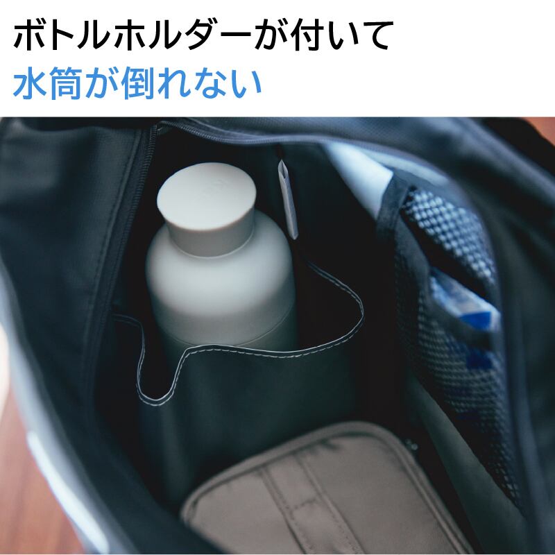 嬉しいボトルホルダー付きで、お好きな飲み物をしっかりと収納できます。マイボトルやペットボトルが内部で倒れるのを防げるほか、裏地がビニール素材なので液漏れの心配なし。