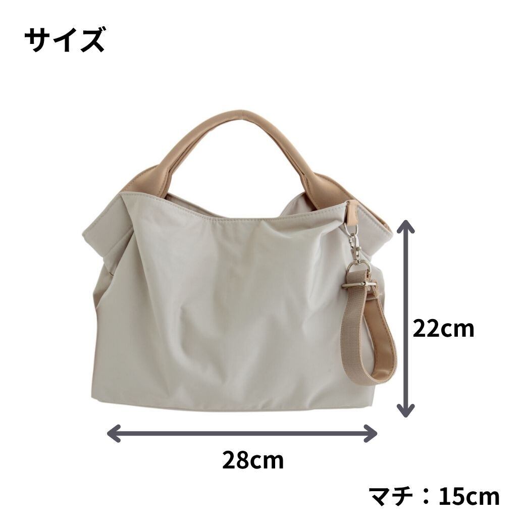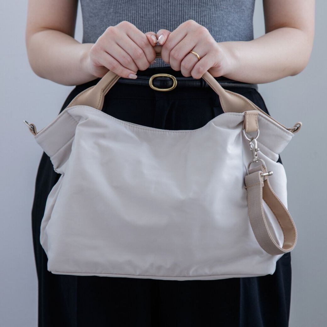 光沢と厚みのあるポリエステル生地に、しっとり質感の合皮ハンドルを合わせました。