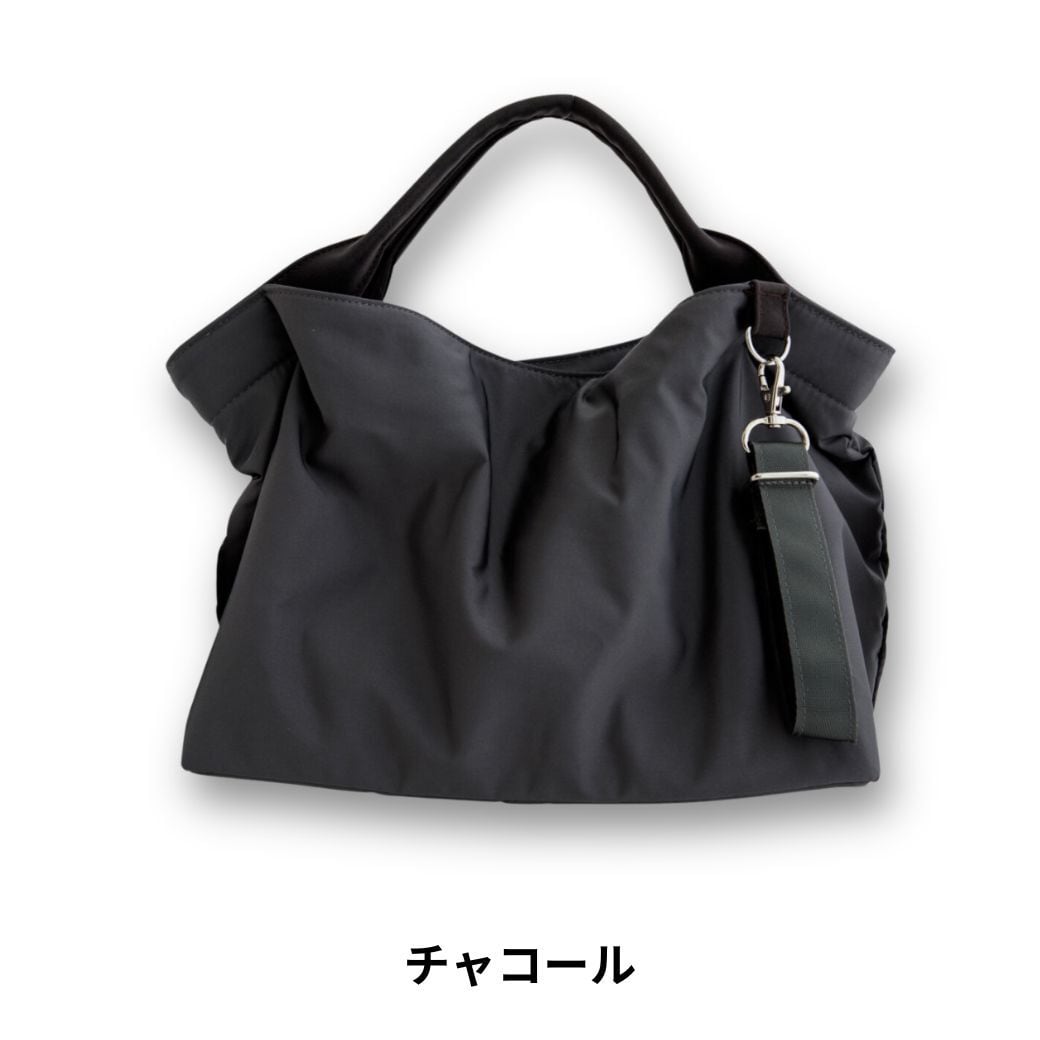 持ち上げるとくったりたゆむフォルムがポイントです。チャームにはお気に入りのストールやアームカバーなどをを取り付けて、自分だけのアレンジを楽しむこともできます。バッグの両端に付いているDカンには、お手持ちのバッグチャームやショルダー紐を取り付けても。