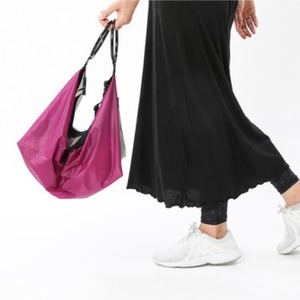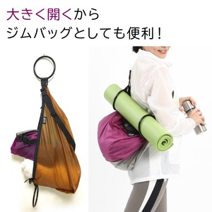 両サイドの円形ハンドルは、ストールを掛けたりキーチェーンをつないでもOK。ヨガマットなども丸めて入れられるサイズ感です。