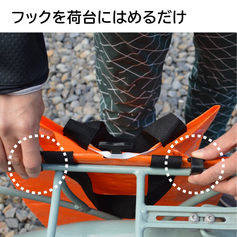 バッグの側面上部に2つのフックがついています。これをリアキャリアに引っ掛けるだけで設置できます。耐荷重は8kgと見た目以上に丈夫です。