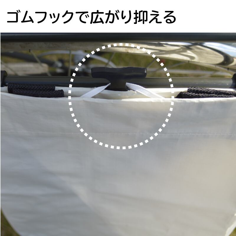 たっぷり運搬できるように底にはマチがついています。バッグの開口部はゴムフックで閉じてお使いください。